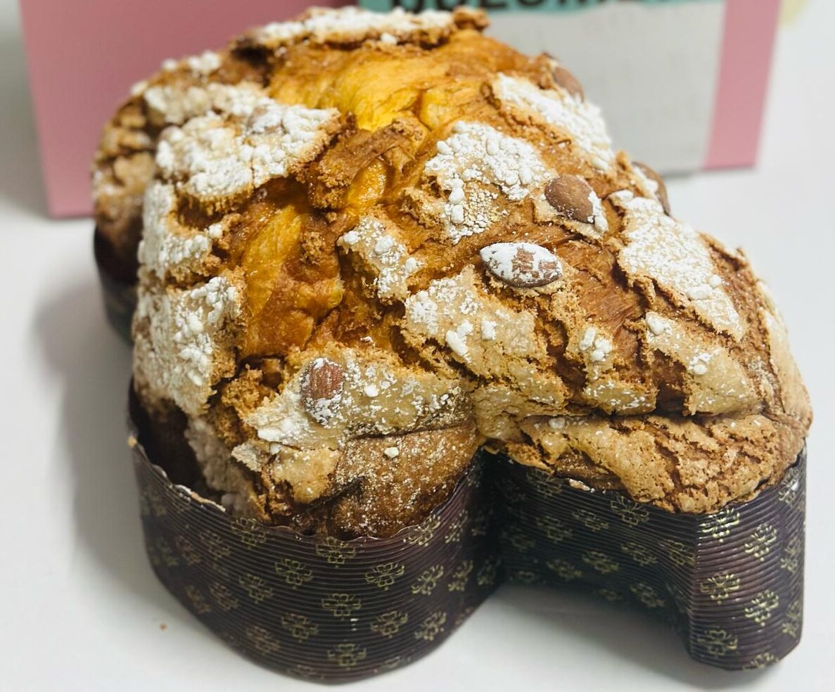 Farina di frumento , Acqua, Tuorlo, Burro,, Arancia candita, Zucchero, Lievito madre (Farina di frumento, Acqua), Pasta d’arancia, Miele, Sale, Pasta di vaniglia Bourbon, Farina di mandorle, Albume, Olio di girasole